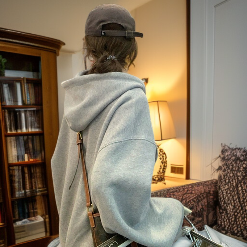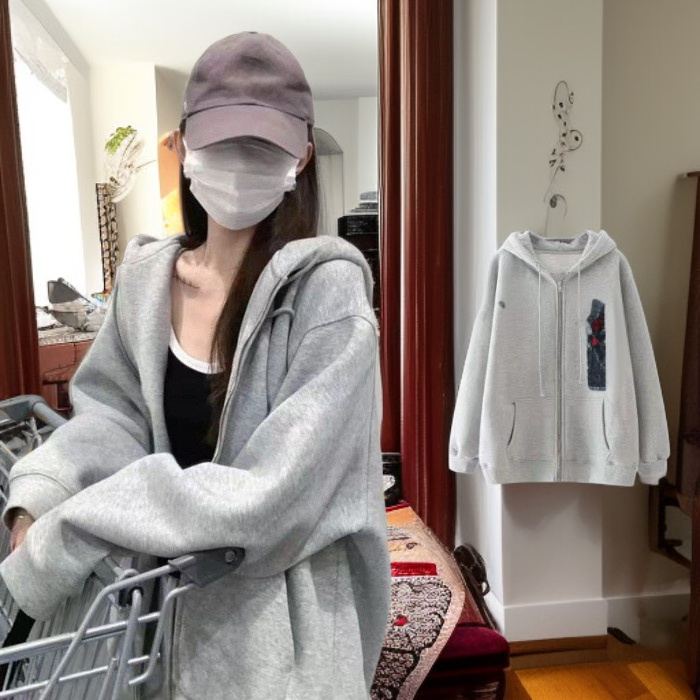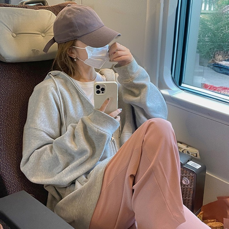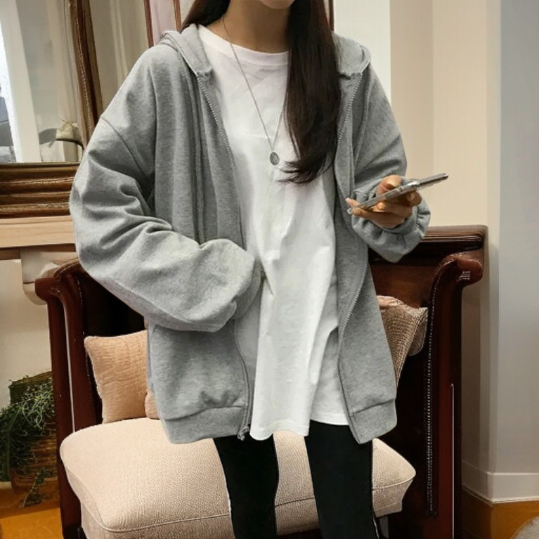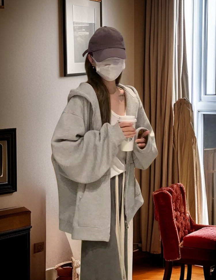 韓国風 ゆったり グレー ジップアップ スウェットパーカー