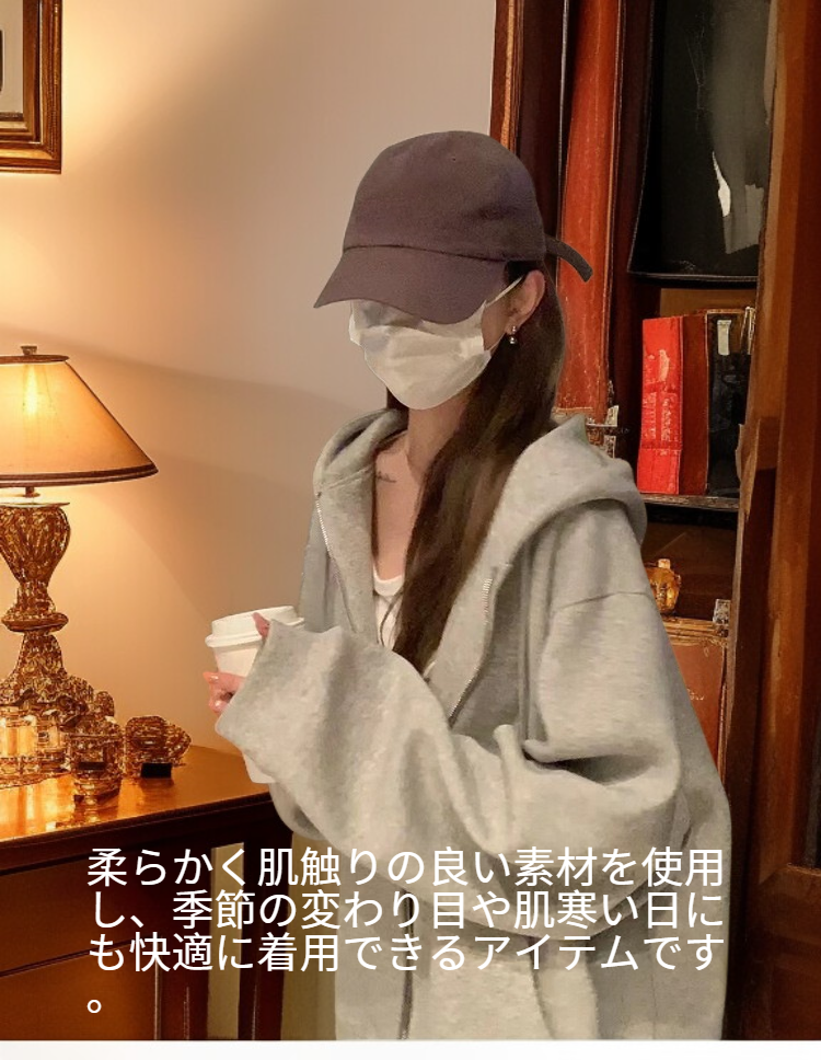 ● トレンド感溢れる韓国風デザインで、どんなコーデにも合わせやすい万能グレーカラーのジップアップスウェットパーカーです。